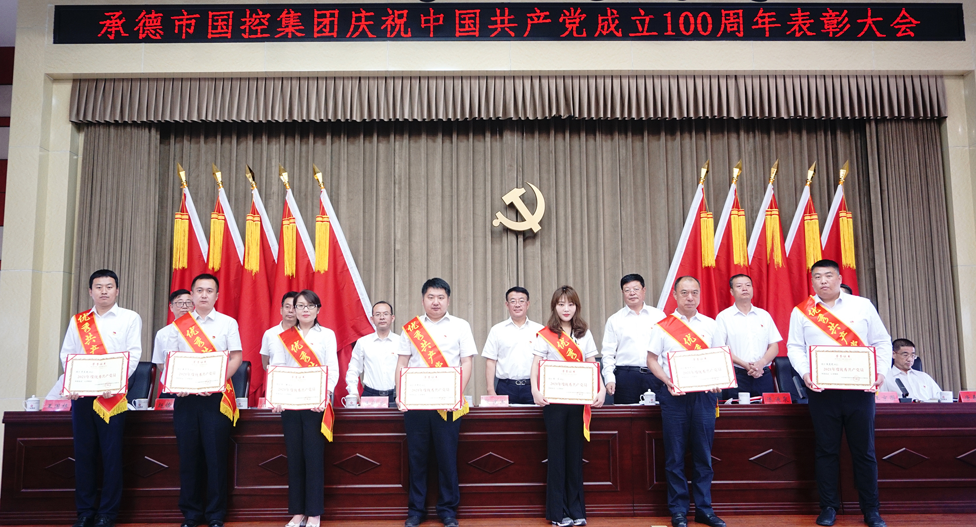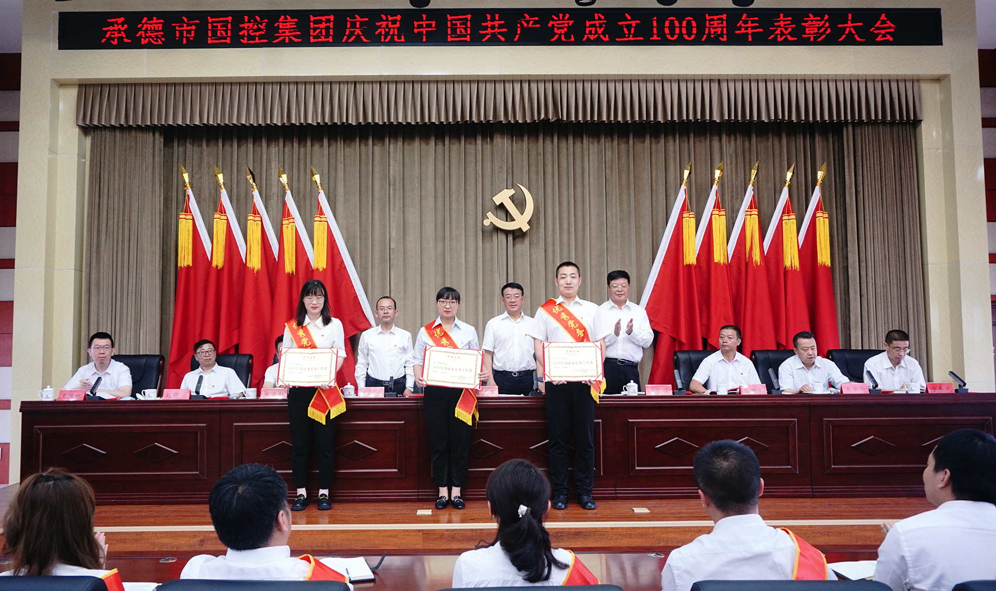 表彰大會氣氛隆重?zé)崃?,大會在全場起立高唱國歌聲中開幕。集團(tuán)公司黨委決定,授予許平凡等7名共產(chǎn)黨員“優(yōu)秀共產(chǎn)黨員”稱號,授予胡斌偉等3名黨務(wù)工作者“優(yōu)秀黨務(wù)工作者”稱號。現(xiàn)場向先進(jìn)個人頒發(fā)了證書,并向參加“慶祝中國共產(chǎn)黨成立100周年書畫攝影大賽”獲獎的人員頒發(fā)了榮譽證書。