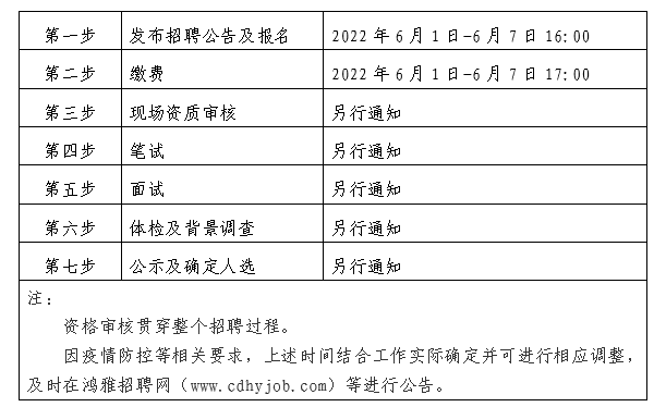 2022年6月1日至2022年6月7日16:00 在鴻雅招聘網(wǎng)(http://www.cdhyjob.com/)、鴻雅微信公眾號、國控集團官方網(wǎng)站(http://m.hnbzcy.com/)及上級部門要求的相關(guān)網(wǎng)站等發(fā)布招聘公告。